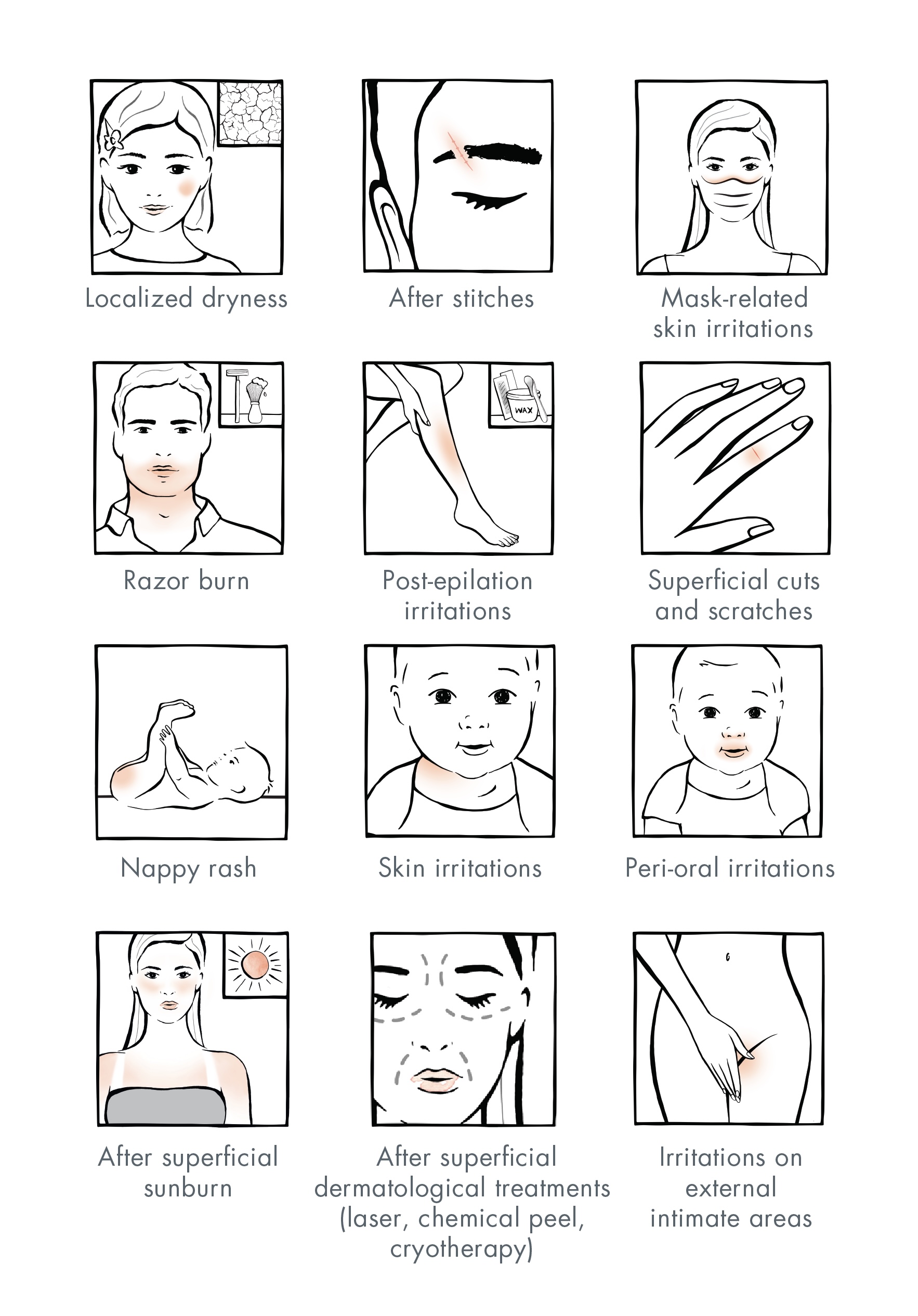 - قابل استفاده برای خراشیدگی، سوختگی، جای زخم بخیه، جای انواع زخم نیش حشرات، جلوگیری از جای جوش، اگزما، زخمهای ناشی از برداشتن خال یا زگیل، سوختگی پای کودک از پوشک، التهابات پوستی ناشی از افتاب سوختگی و سولاریومه، پس از انجام کارهای درماتولوژیک (مثل لیزر، پیلینگ، اعمال جراحی و …)